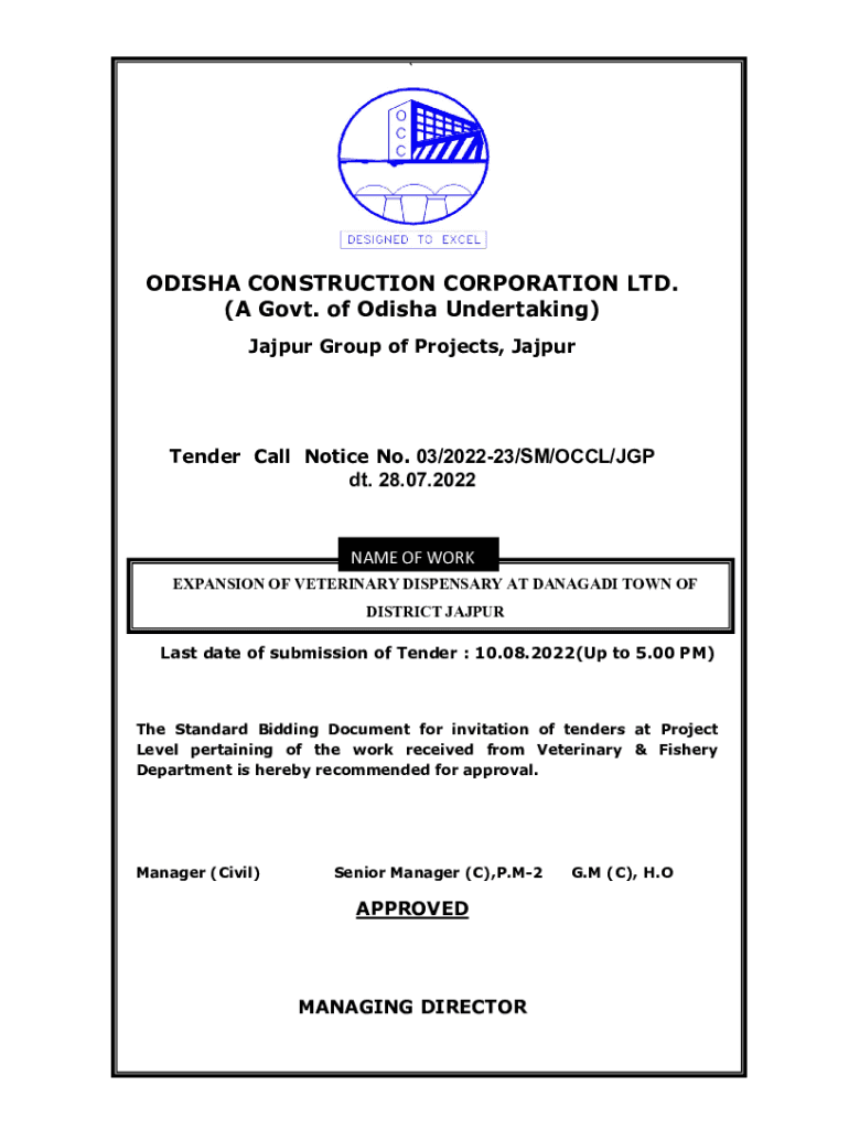 `ODISHA CONSTRUCTION CORPORATION LTD. (A Govt. of Odisha Undertaking) Jaipur Group of Projects, JajpurTender Call Notice No. 03/202223/SM/ECCL/PDT. 28.07.2022NAME OF WORK EXPANSION OF VETERINARY DISPENSARY