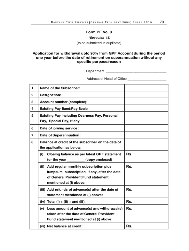 H A R Y A N A C I V I L S E R V I C E S (G E N E R A L P R O V I D E N T F U N D) R U L E S, 2 01 679Form PF No. 8 (See rules 48)(to be submitted in duplicate)Application for withdrawal unto 90% from