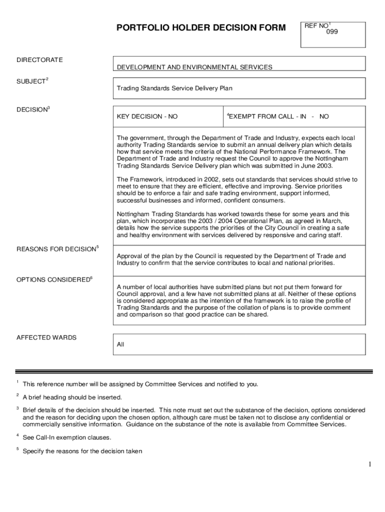 PORTFOLIO HOLDER DECISION FORMER NO1099DIRECTORATE DEVELOPMENT AND ENVIRONMENTAL SERVICES SUBJECT2Trading Standards Service Delivery PlanDECISION3KEY DECISION NO4EXEMPT FROM CALL IN Note government,