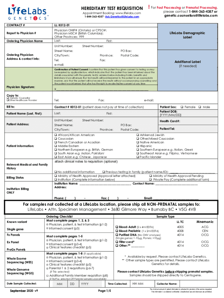 ! For Fast Processing or Prenatal Processing, HEREDITARY TEST REQUISITION please contact 18443634357 or