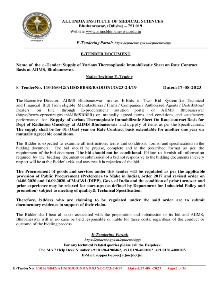 ALL INDIA INSTITUTE OF MEDICAL SCIENCES Bhubaneswar, (Odisha) 751 019 Website:www.aiimsbhubaneswar.edu.in Tendering Portal: https://eprocure.gov.in/eprocure/app TENDER DOCUMENT Name of the e Tender: