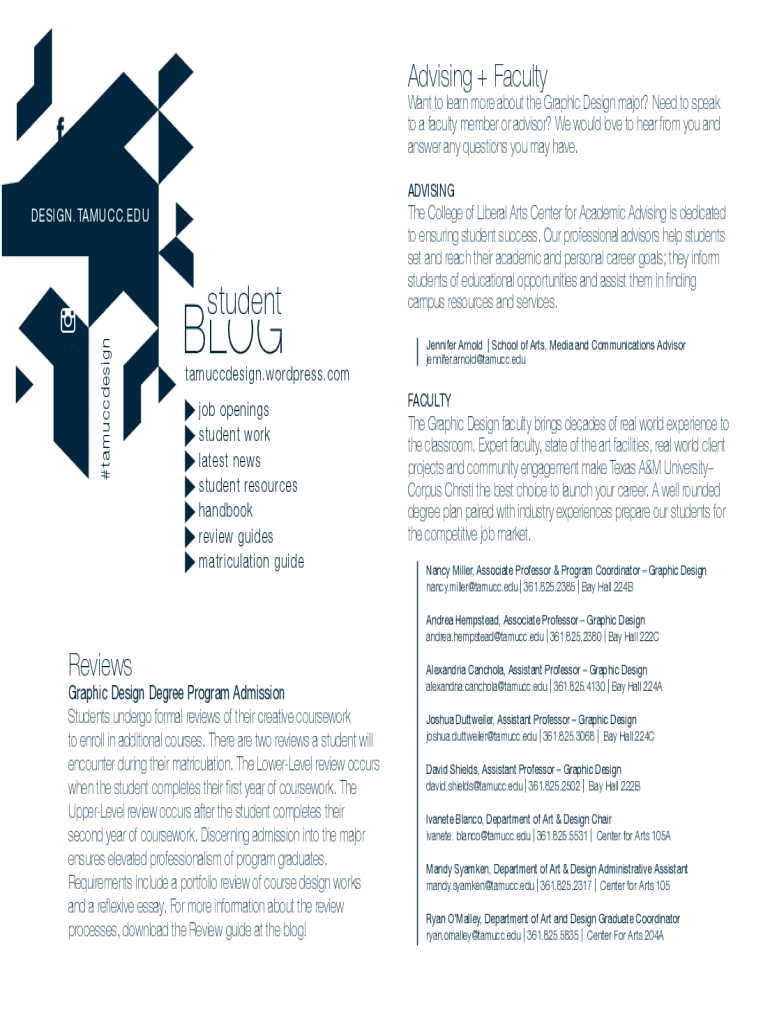 Advising + FacultyWant to learn more about the Graphic Design major? Need to speak to a faculty member or advisor? We would love to hear from you and answer any questions you may have. ADVISINGDESIGN.TAM