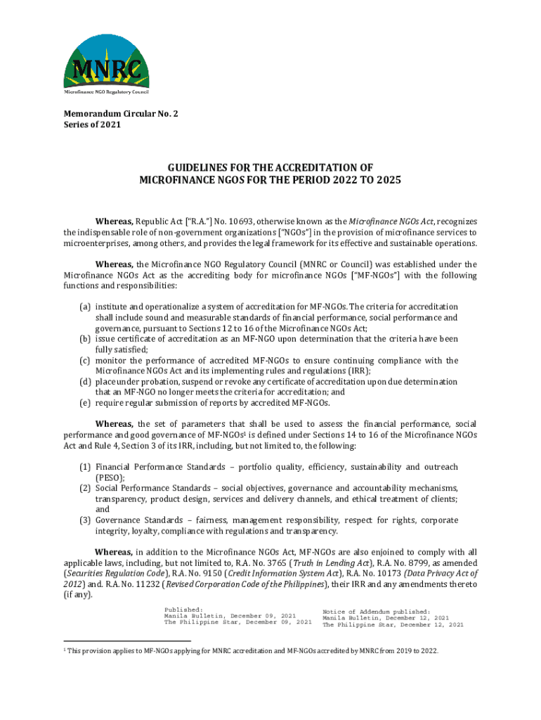 Memorandum Circular No. 2 Series of 2021GUIDELINES FOR THE ACCREDITATION OF MICROFINANCE NGOs FOR THE PERIOD 2022 TO 2025Whereas, Republic Act [R.A.] No. 10693, otherwise known as the Microfinance