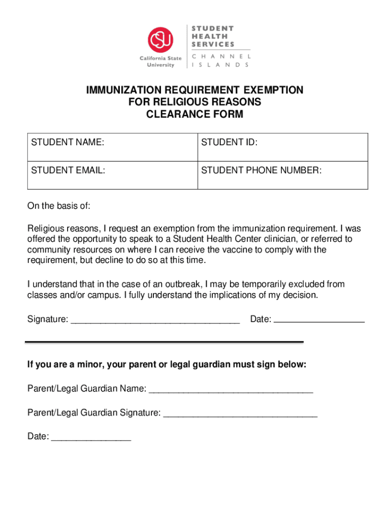 IMMUNIZATION REQUIREMENT EXEMPTION FOR RELIGIOUS REASONS CLEARANCE FORM STUDENT NAME:STUDENT ID:STUDENT EMAIL:STUDENT PHONE NUMBER:On the basis of: Religious reasons, I request an exemption from the
