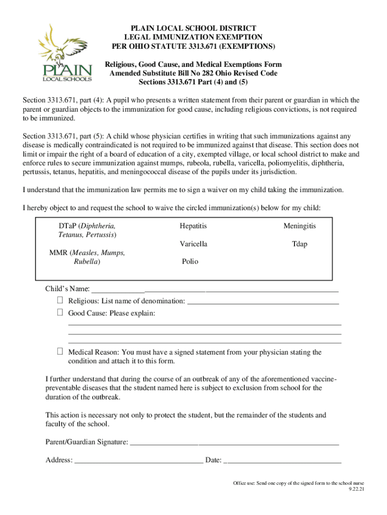 PLAIN LOCAL SCHOOL DISTRICT LEGAL IMMUNIZATION EXEMPTION PER OHIO STATUTE 3313.671 (EXEMPTIONS) Religious, Good Cause, and Medical Exemptions Form Amended Substitute Bill No 282 Ohio Revised Code