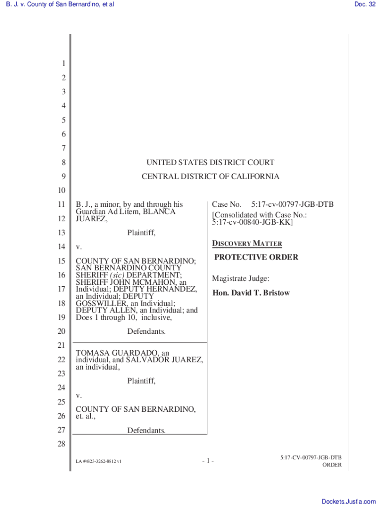 B. J. v. County of San Bernardino, et Aldo. 321 2 3 4 5 6 7 8UNITED STATES DISTRICT COURT9CENTRAL DISTRICT OF CALIFORNIA10 11 12Case No. 5:17cv00797JGBDTB [Consolidated with Case No.: 5:17cv00840JGBKK]B.