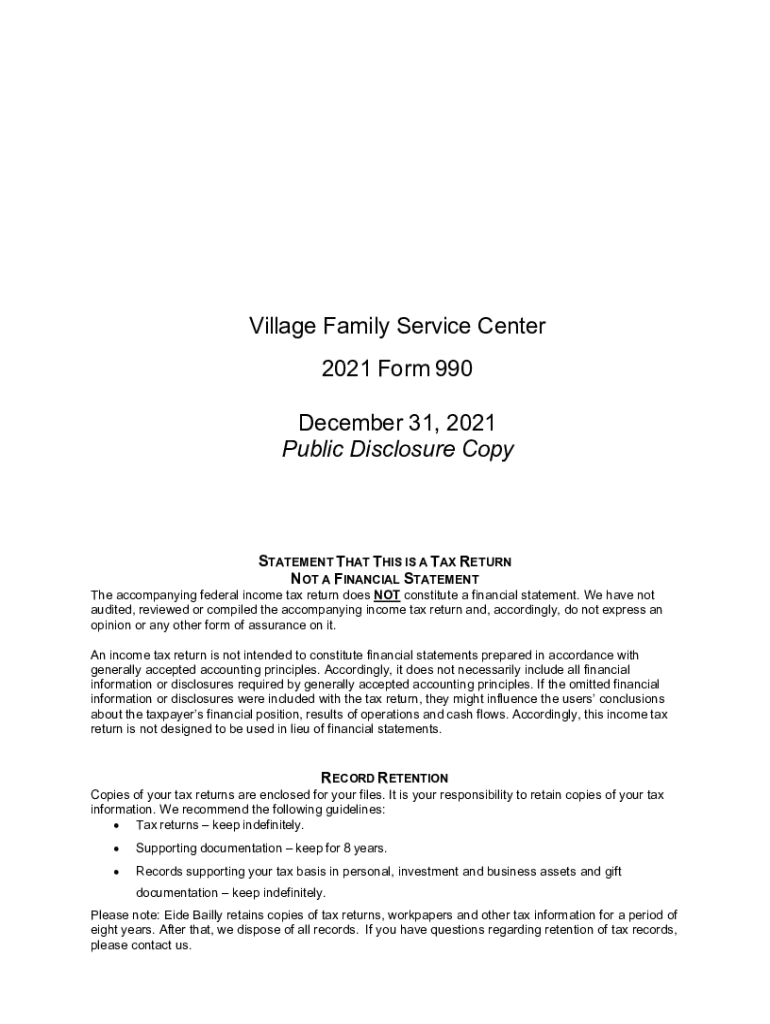 Village Family Service Center 2021 Form 990 December 31, 2021, Public Disclosure CopySTATEMENT THAT THIS IS A TAX RETURN NOT A FINANCIAL Statement accompanying federal income tax return does NOT constitute