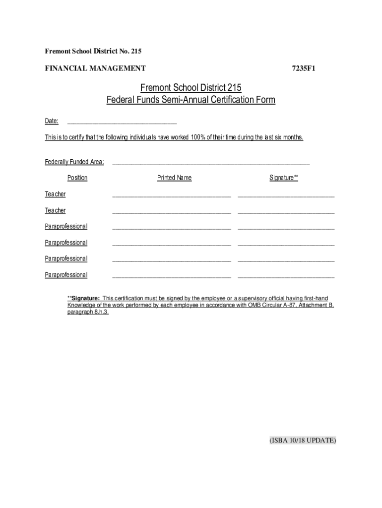 Fremont School District No. 215FINANCIAL MANAGEMENT7235F1Fremont School District 215 Federal Funds Semiannual Certification Form Date:___This is to certify that the following individuals have worked