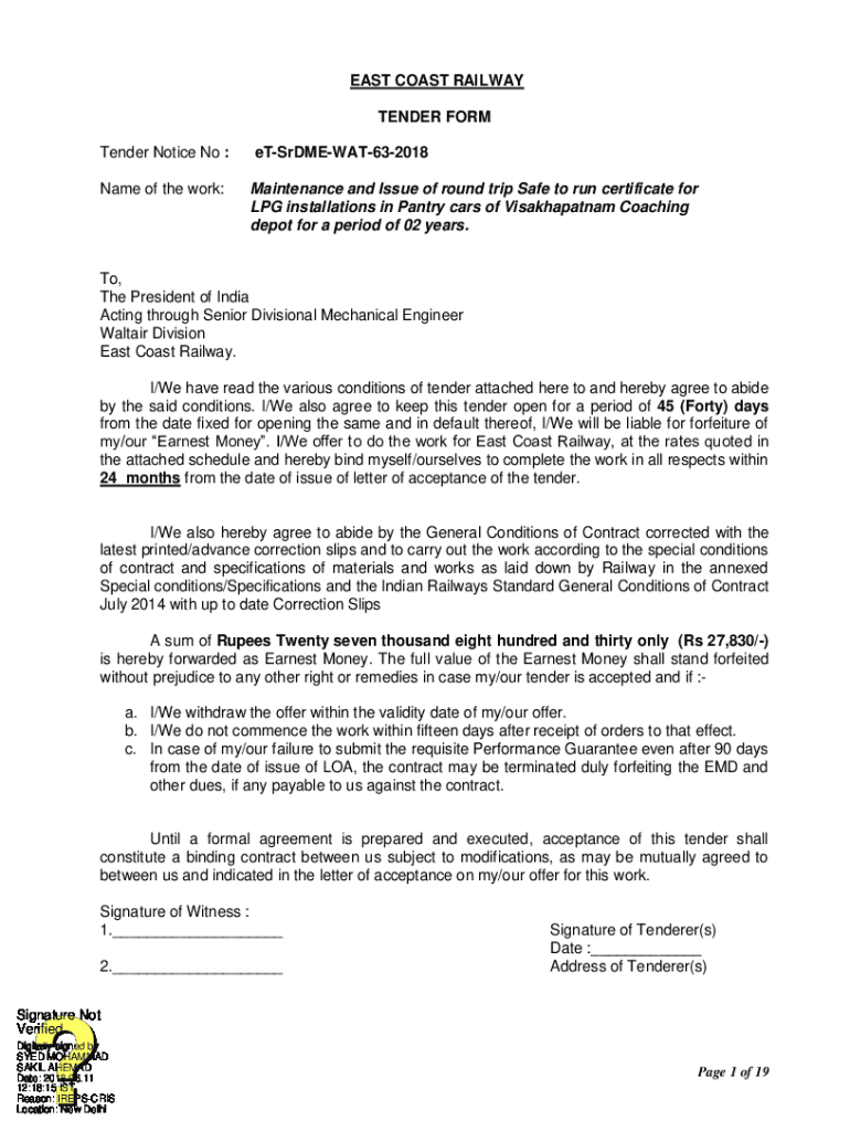 EAST COAST RAILWAY TENDER FORM Tender Notice No : Name of the work:eTSrDMEWAT632018 Maintenance and Issue of round trip Safe to run certificate for LPG installations in Pantry cars of Visakhapatnam