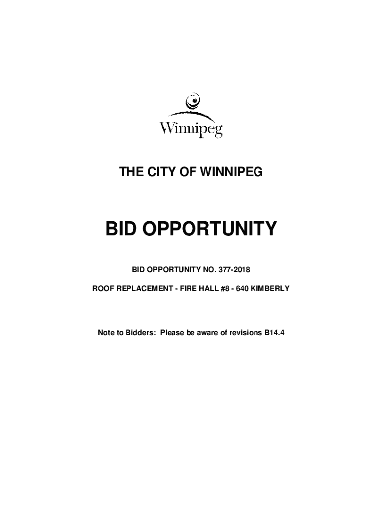THE CITY OF WINNIPEG OPPORTUNITY BID OPPORTUNITY NO. 3772018 ROOF REPLACEMENT FIRE HALL #8 640 KIMBERLYNote to Bidders: Please be aware of revisions B14.4The City of Winnipeg Bid Opportunity No. 3772018Table