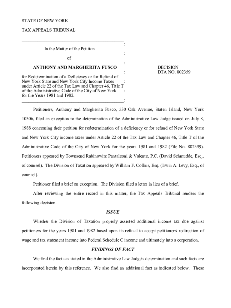 STATE OF NEW YORK TAX APPEALS TRIBUNAL ___:In the Matter of the Petition:of ANTHONY AND MARGHERITA CUSCO: :for Redetermination of a Deficiency or for Refund of New York State and New York City Income