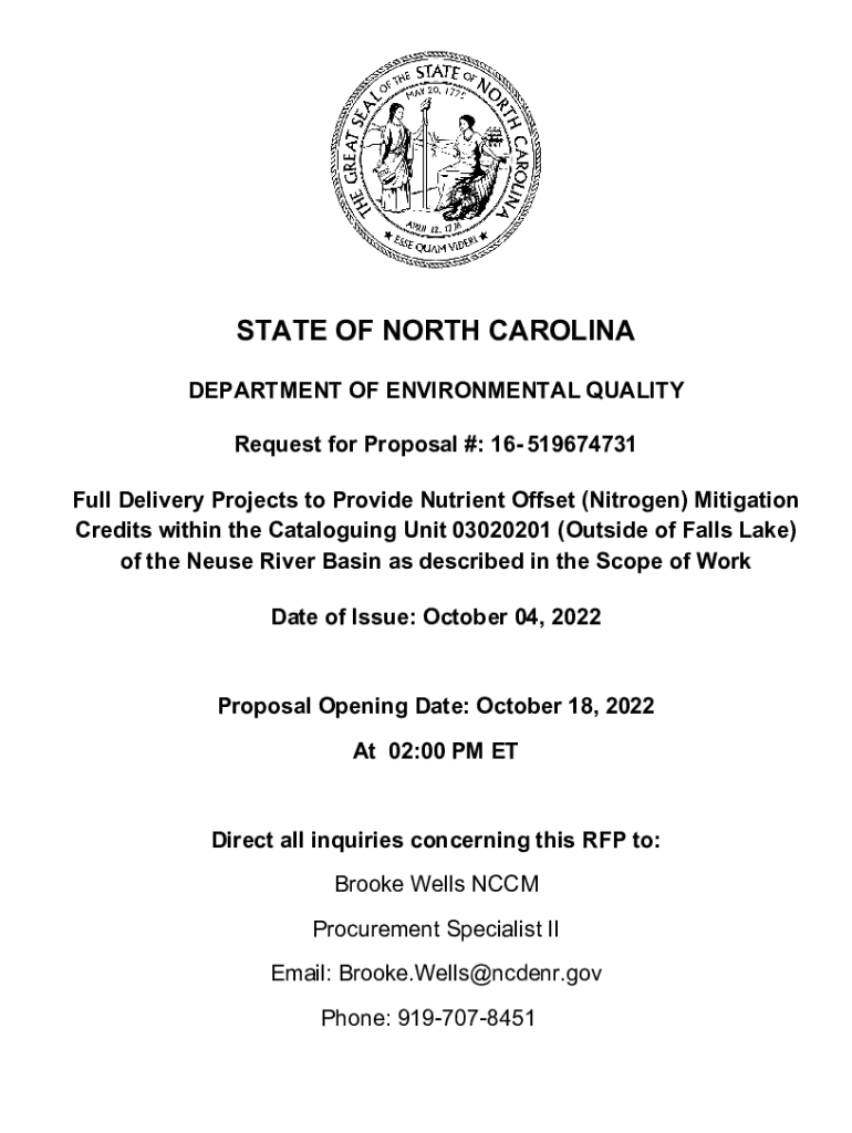 STATE OF NORTH CAROLINA DEPARTMENT OF ENVIRONMENTAL QUALITY Request for Proposal #: 16 519674731 Full Delivery Projects to Provide Nutrient Offset (Nitrogen) Mitigation Credits within the Cataloging
