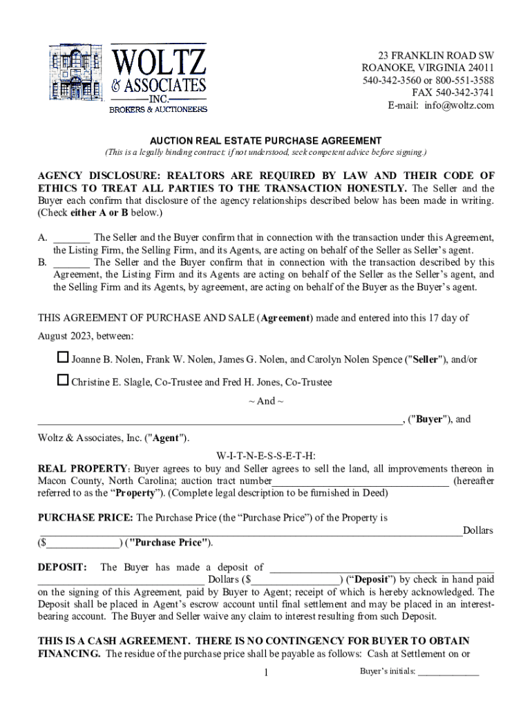23 FRANKLIN ROAD SW ROANOKE, VIRGINIA 24011 5403423560 or 8005513588 FAX 5403423741 Email: info@woltz.com AUCTION REAL ESTATE PURCHASE AGREEMENT (This is a legally binding contract; if not understood,