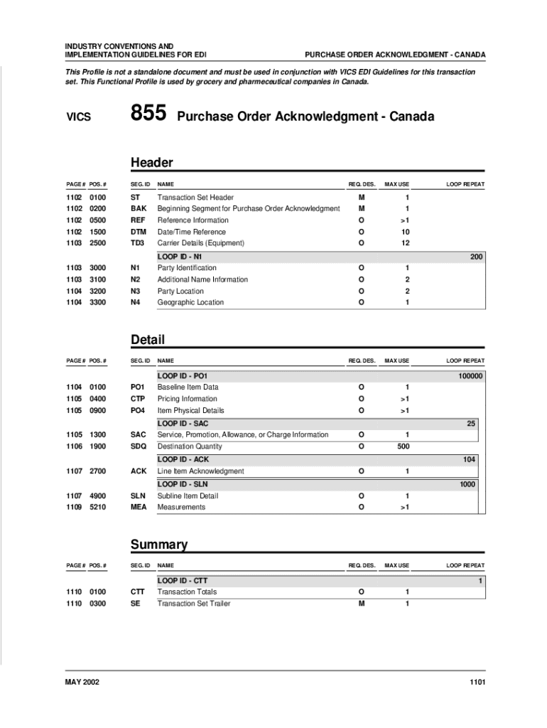 IMPLEMENTATION GUIDELINES FOR PURCHASE ORDER ACKNOWLEDGMENT CANADAThis Profile is not a standalone document and must be used in conjunction with VICE EDI Guidelines for this