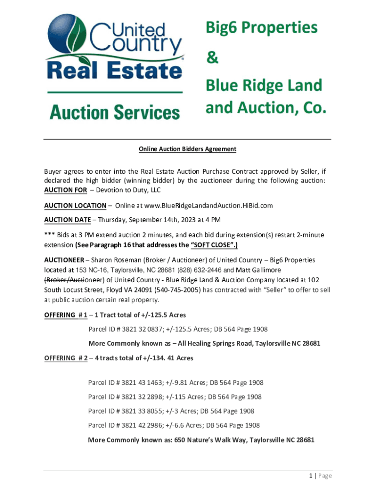Online Auction Bidders AgreementBuyer agrees to enter into the Real Estate Auction Purchase Contract approved by Seller, if declared the high bidder (winning bidder) by the auctioneer during the following