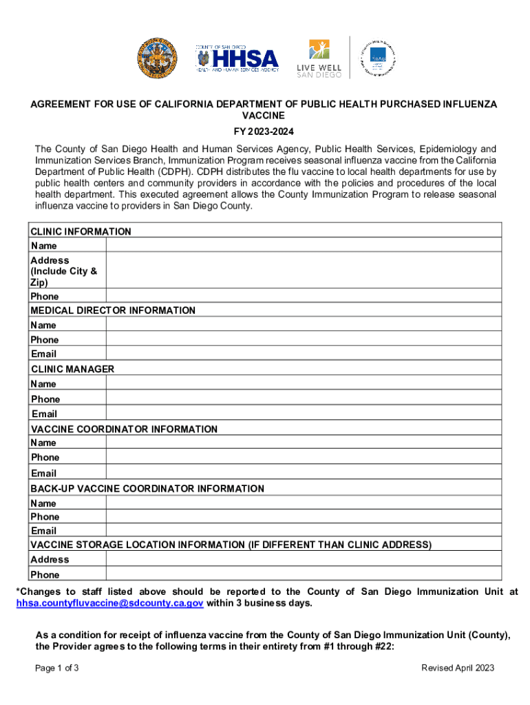 AGREEMENT FOR USE OF CALIFORNIA DEPARTMENT OF PUBLIC HEALTH PURCHASED INFLUENZA VACCINE FY 20232024 The County of San Diego Health and Human Services Agency, Public Health Services, Epidemiology and