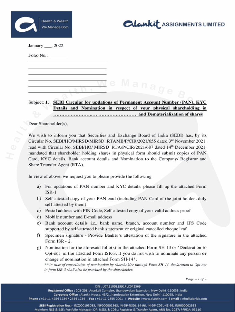 January ___, 2022 Folio No.: ___ ___ ___ ___ ___ ___ ___ Subject: 1. SEMI Circular for updates of Permanent Account Number (PAN), KYC Details and Nomination in respect of your physical shareholding