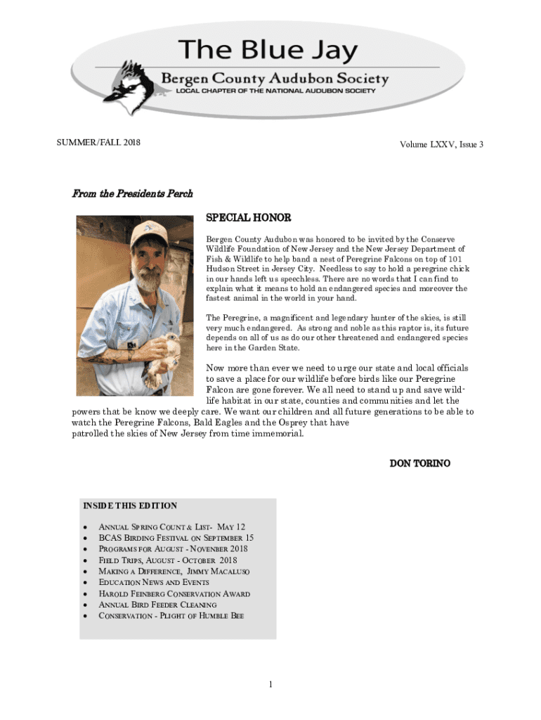 SUMMER/FALL 2018Volume LXIV, Issue 3From the Presidents Perch SPECIAL HONOR Bergen County Audubon was honored to be invited by the Conserve Wildlife Foundation of New Jersey and the New Jersey Department