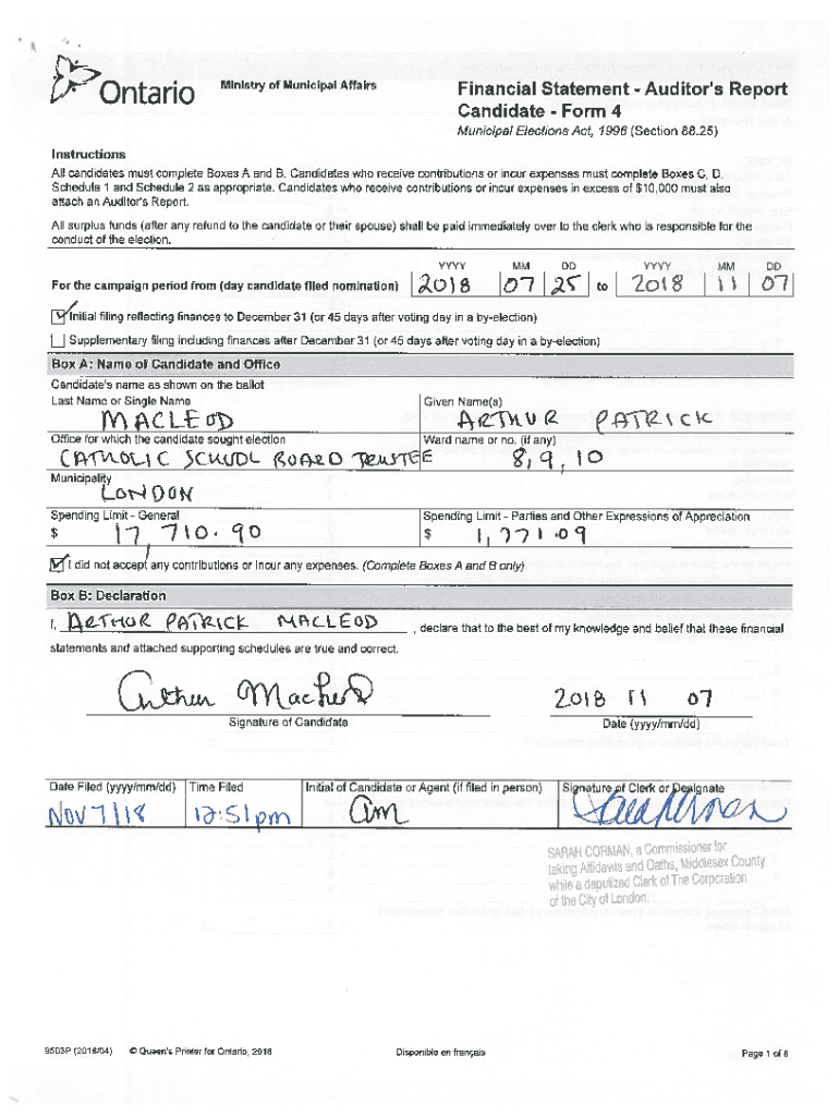 , nOntarioMinistry of Municipal AffairsFinancial Statement Auditors Report Candidate Form 4 Municipal Elections Act 1996 (Section 88.25)Instructions All candidates must complete Boxes A and B. Candidates