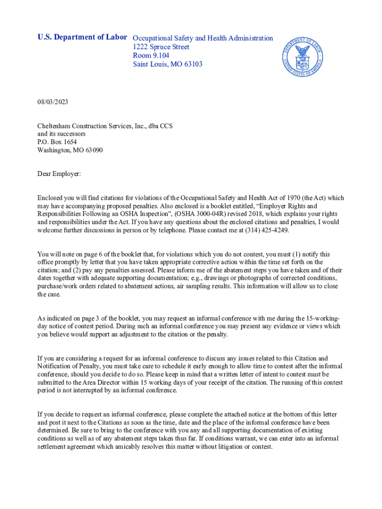 U.S. Department of Labor Occupational Safety and Health Administration 1222 Spruce Street Room 9.104 Saint Louis, MO 6310308/03/2023 Cheltenham Construction Services, Inc., DBA CCS and its successors
