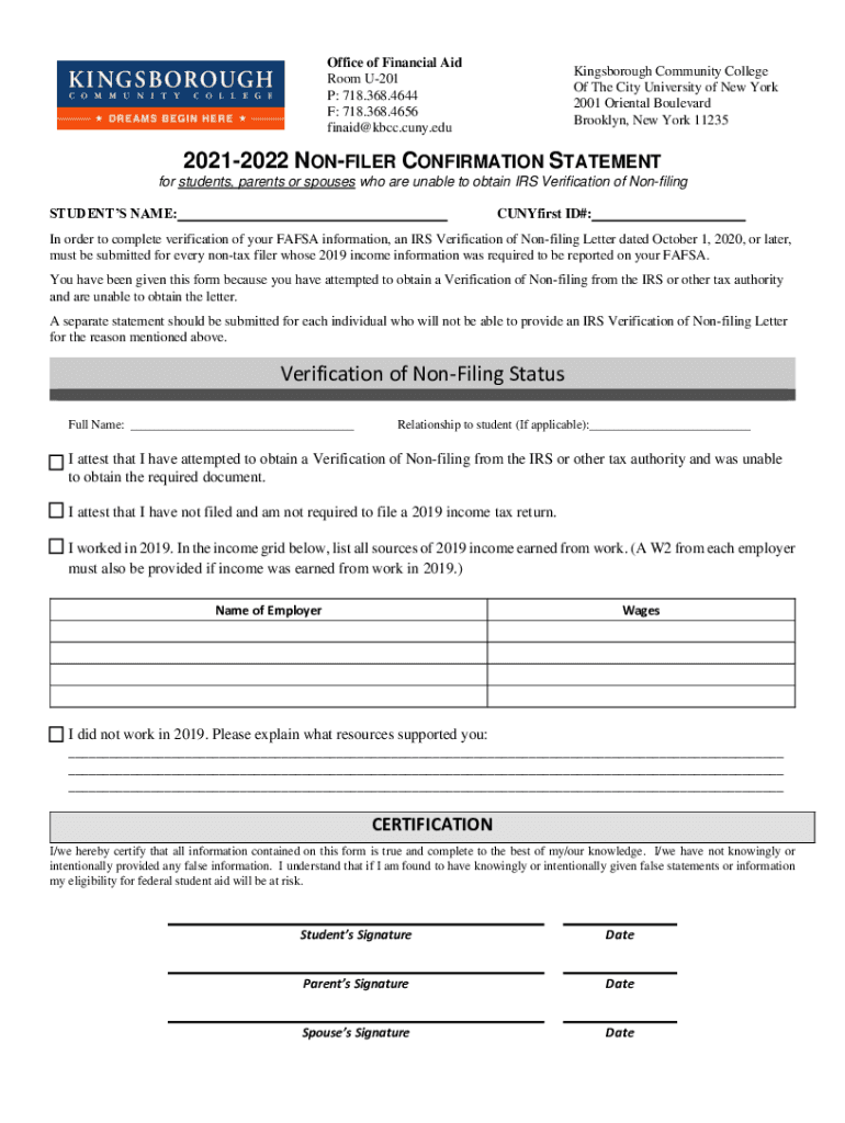 Get the free Verification of Non-Filing Status - Kingsborough Community College