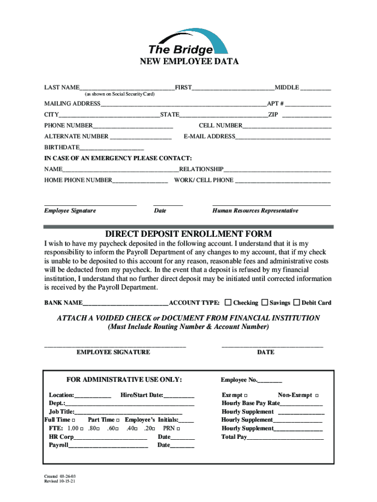 Get the free NEW EMPLOYEE DATA DIRECT DEPOSIT ENROLLMENT FORM