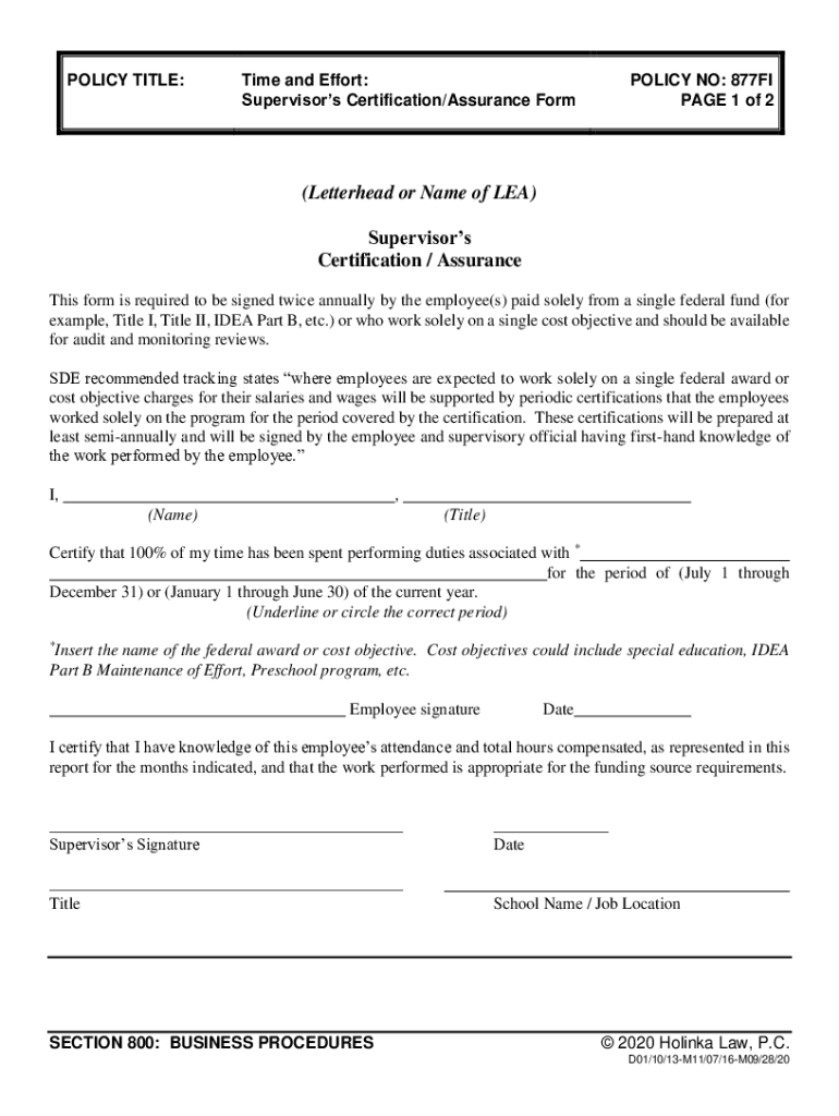 POLICY TITLE:Time and Effort: Supervisors Certification/Assurance Formality NO: 877FI PAGE 1 of 2(Letterhead or Name of LEA) Supervisors Certification / Assurance This form is required to be signed