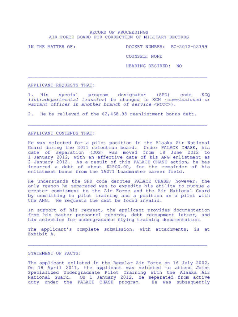 RECORD OF PROCEEDINGS AIR FORCE BOARD FOR CORRECTION OF MILITARY RECORDS IN THE MATTER OF:DOCKET NUMBER:BC201202399COUNSEL: NONE HEARING DESIRED:NO___ APPLICANT REQUESTS THAT: 1. His special program