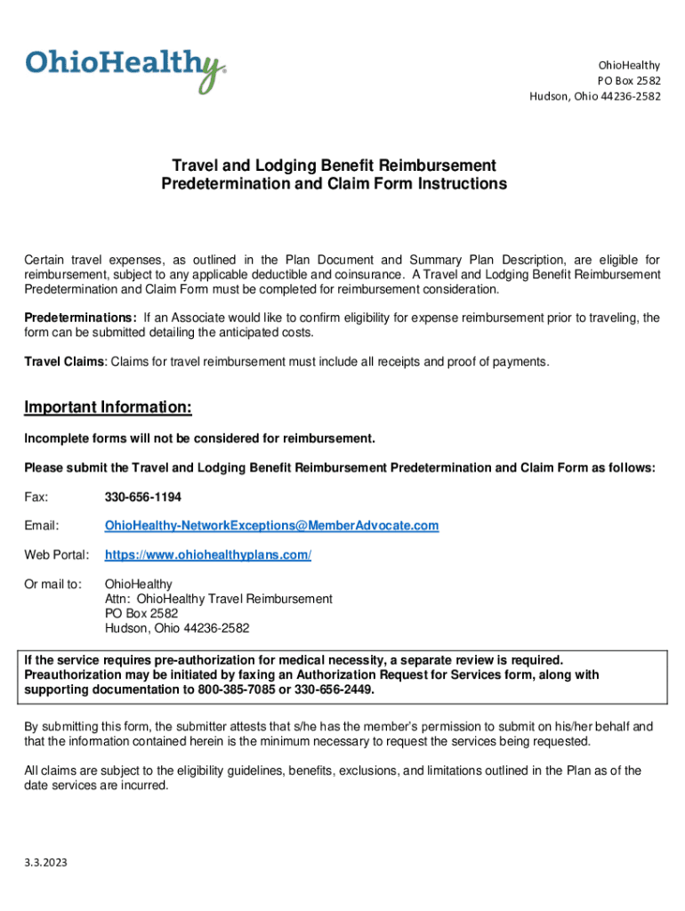 OhioHealthy PO Box 2582 Hudson, Ohio 442362582Travel and Lodging Benefit Reimbursement Predetermination and Claim Form InstructionsCertain travel expenses, as outlined in the Plan Document and Summary