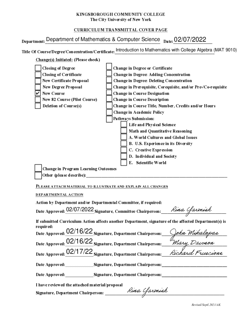 GAINSBOROUGH COMMUNITY COLLEGE The City University of New York CURRICULUM TRANSMITTAL COVER PAGEDepartment of Mathematics & Computer Science Date:___ 02/07/2022 Department:___ Introduction to Mathematics