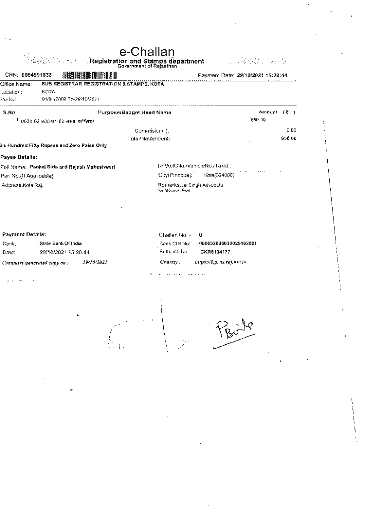 Achaean Registration and Stamps department Government o Rajasthan: 0054991833IIII 11111 lIlIlIIIIIIPayment Date: 29/10/2021 15:20:44IIOffice Name: SUB REGISTRAR REGISTRATION & STAMPS, IOTA Location: