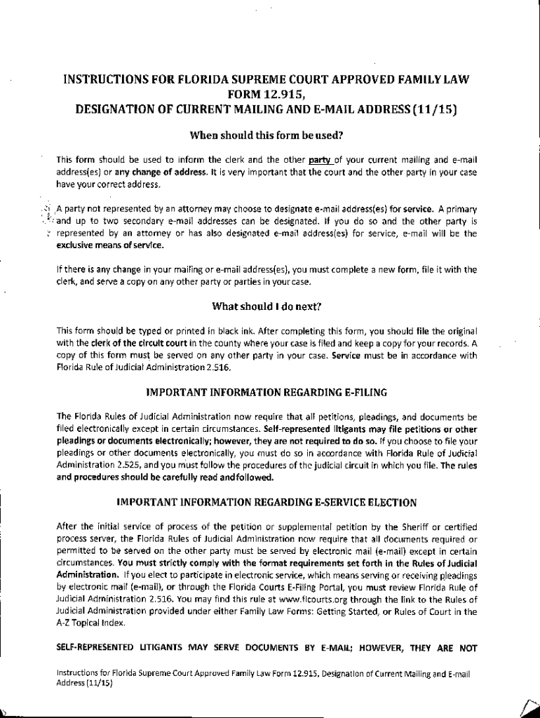 INSTRUCTIONS FOR FLORIDA SUPREME COURT APPROVED FAMILY LAW FORM 12.915, DESIGNATION OF CURRENT MAILING AND EMAIL ADDRESS (11/15) When should this form be used? This form should be used to inform the