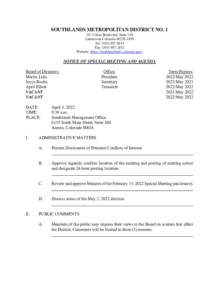 SOUTHLAND METROPOLITAN DISTRICT NO. 1 141 Union Boulevard, Suite 150 Lakewood, Colorado 802281898 Tel: (303) 9870835 Fax: (303) 9872032 Website: https://southlandsmd1.colorado.gov/NOTICE OF SPECIAL