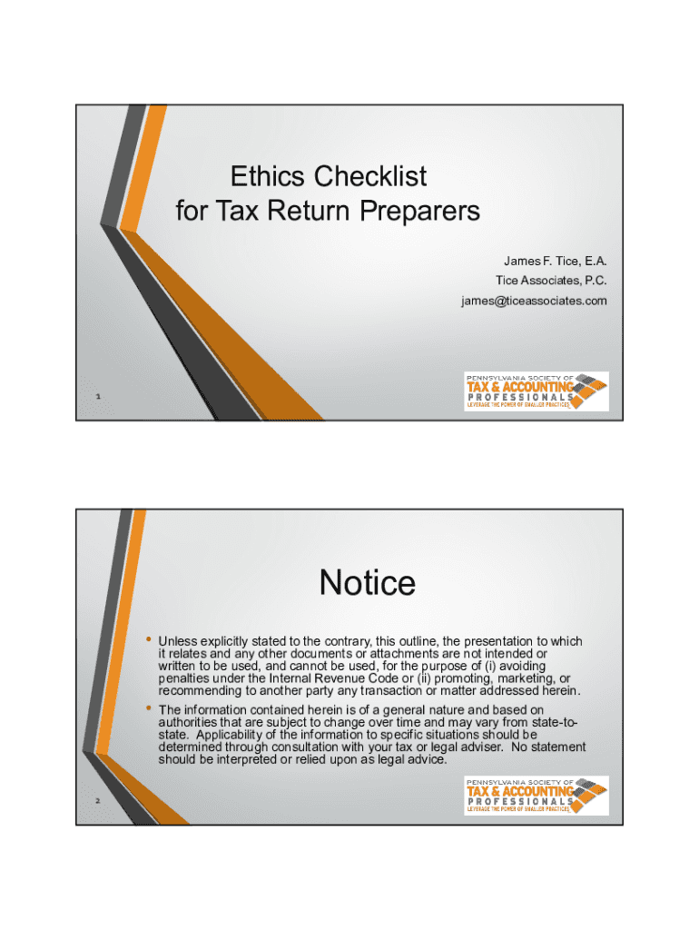 Ethics Checklist for Tax Return Preparers James F. Time, E.A. Time Associates, P.C. james@ticeassociates.com1Notice Unless explicitly stated to the contrary, this outline, the presentation to which