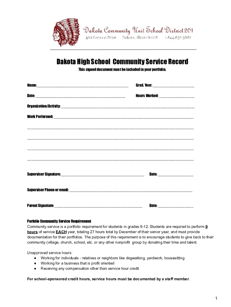 Dakota High School Community Service Record This signed document must be included in your portfolio. Name:___Grad. Year: ___Date: ___Hours Worked: ___Organization/Activity: ___ Work Performed: ___