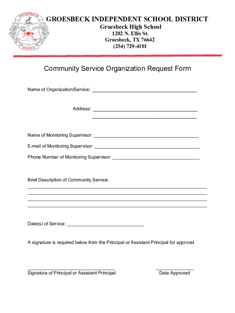 GROSBEAK INDEPENDENT SCHOOL DISTRICT Grosbeak High School 1202 N. Ellis St. Grosbeak, TX 76642 (254) 7294101Community Service Organization Request Form Name of Organization/Service: ___ Address: ______Name