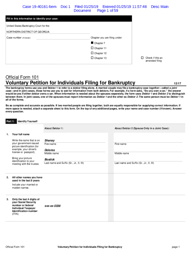 Case 1940161bemDoc 1Filed 01/25/19 Entered 01/25/19 11:57:48 Document Page 1 of 59Desc Rainfall in this information to identify your case: United States Bankruptcy Court for the: NORTHERN DISTRICT