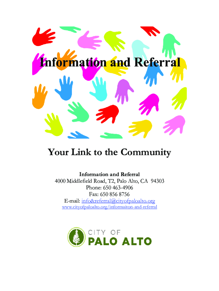 Information and ReferralYour Link to the Community Information and Referral 4000 Middle field Road, T2, Palo Alto, CA 94303 Phone: 650 4634906 Fax: 650 856 8756 Email: info&referral@cityofpaloalto.org