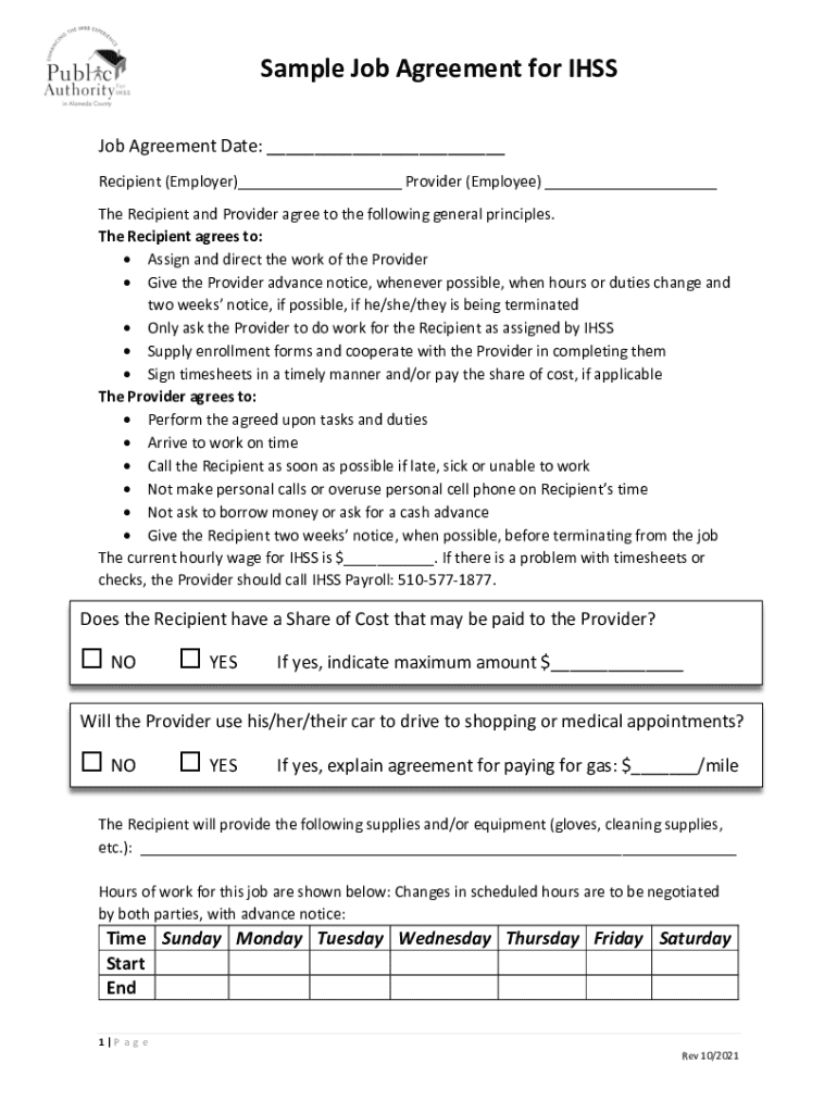 Sample Job Agreement for IHSS Job Agreement Date: ___ Recipient (Employer)___ Provider (Employee) ___ The Recipient and Provider agree to the following general principles. The Recipient agrees to: