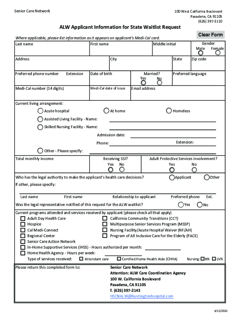 Subject: Waitlist Application for Assisted Living Waiver (ALW) Program Huntington Senior Care Network, an Assisted Living Waiver (ALW) Care Coordination Agency (CCA), is pleased to help you with your