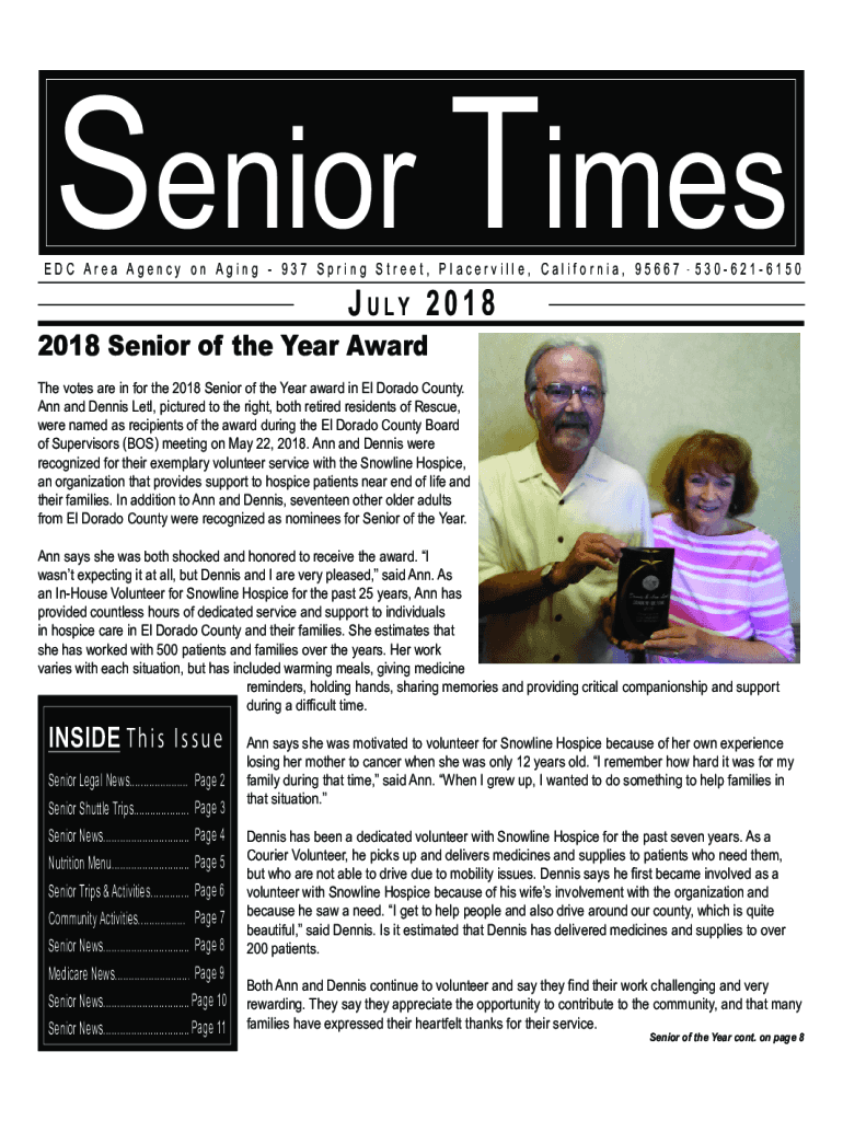 Senior Times EDC Area Agency on Aging 937 Spring Street, Porterville, California, 95667J u LY 2 0 1 853062161502018 Senior of the Year Awardee votes are in for the 2018 Senior of the Year award in