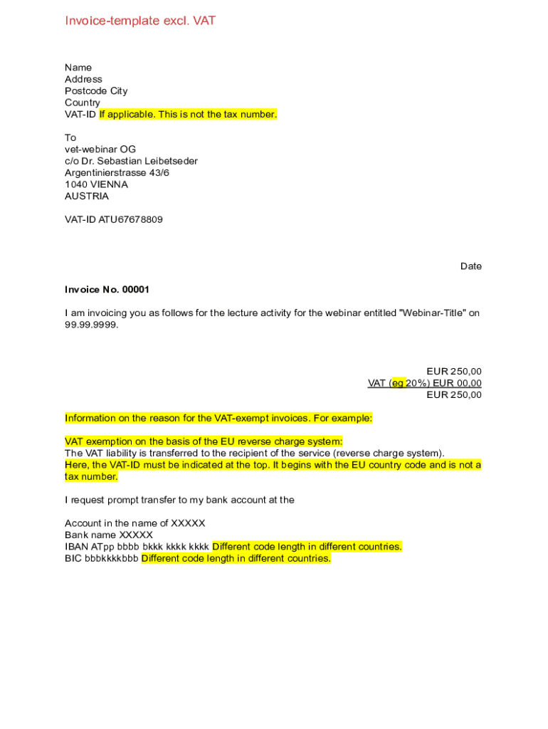 Invoice template excl. Name Address Postcode City Country VALID If applicable. This is not the tax number. To vet webinar OG c/o Dr. Sebastian Leibetseder Argentinierstrasse 43/6 1040 VIENNA AUSTRIA