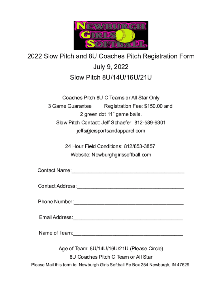 Get the free 2022 Slow Pitch and 8U Coaches Pitch Registration Form