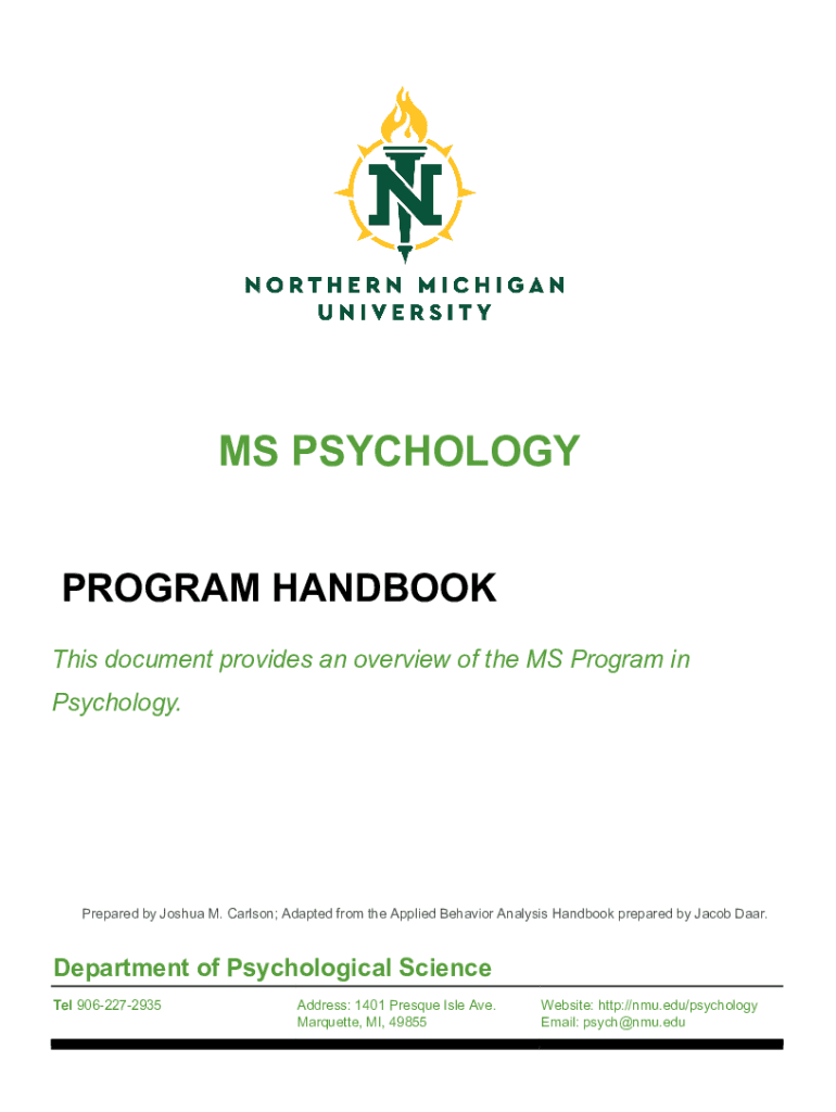 MS PSYCHOLOGY PROGRAM HANDBOOK This document provides an overview of the MS Program in Psychology. Prepared by Joshua M. Carlson; Adapted from the Applied Behavior Analysis Handbook prepared by Jacob