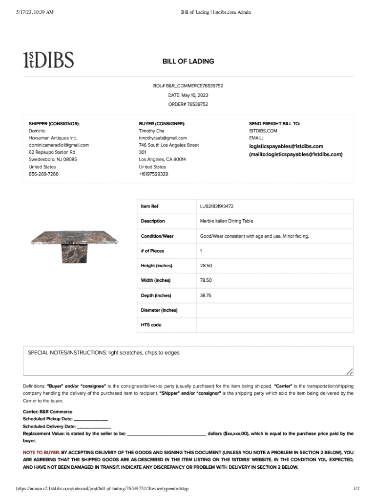 5/17/23, 10:39 AM Bill of Lading | 1stdibs.com AdminBILL OF LADING BOX# B&R_COMMERCE76539752 DATE: May 10, 2023, ORDER# 76539752SHIPPER (CONSIGNOR):BUYER (CONSIGNEE):SEND FREIGHT BILL TO:Dominic Horseman
