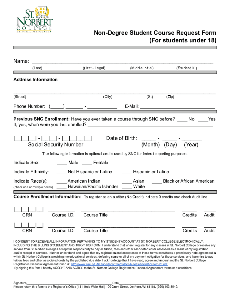 NonDegree Student Course Request Form (For students under 18) ___Name: ___ (Last)(First Legal)(Middle Initial)(Student ID)Address Information___ (Street)(City)Phone Number: (___) ___ ___(St)(Zip)Email: