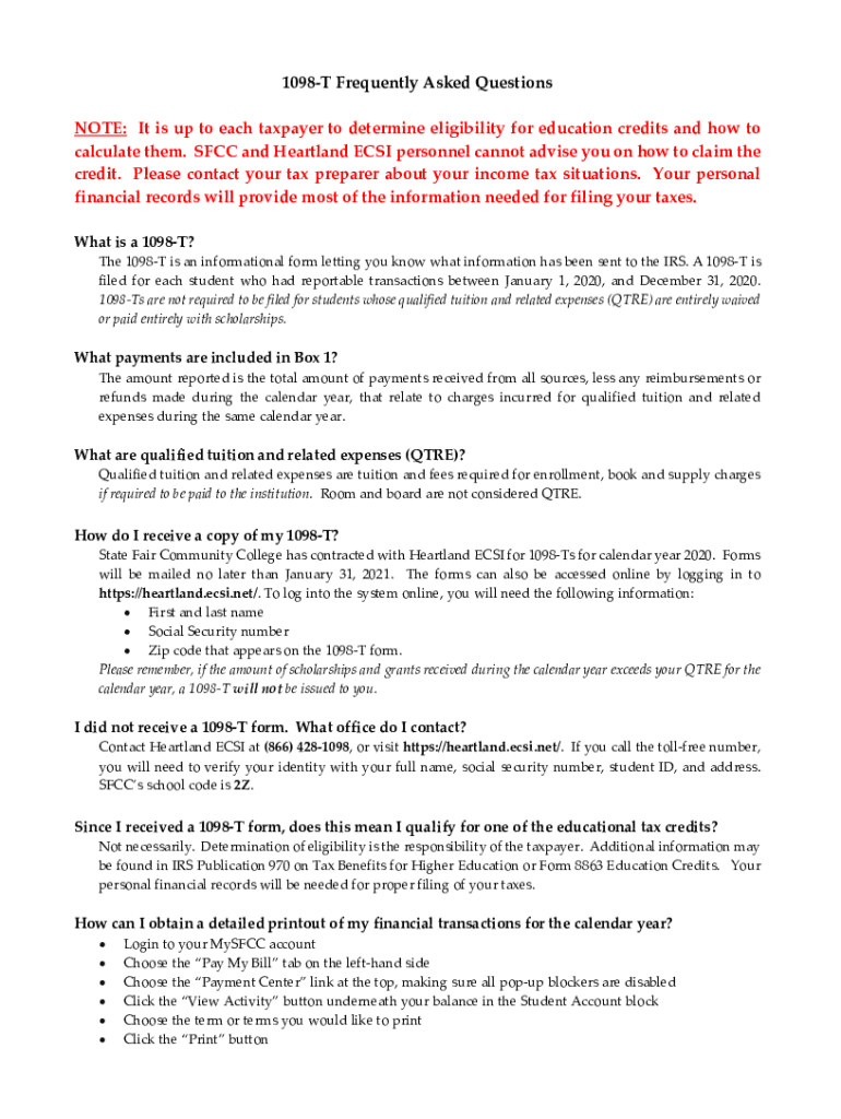 1098T Frequently Asked Questions NOTE: It is up to each taxpayer to determine eligibility for education credits and how to calculate them. FCC and Heartland CSI personnel cannot advise you on how