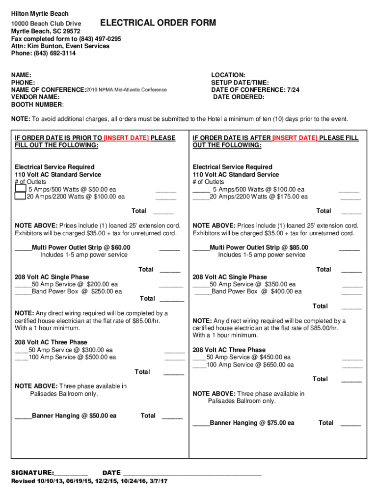 Hilton Myrtle Beach 10000 Beach Club Drive ELECTRICAL Myrtle Beach, SC 29572 Fax completed form to (843) 4970295 Attn: Kim Button, Event Services Phone: (843) 6923114ORDER FORENAME: PHONE: NAME OF