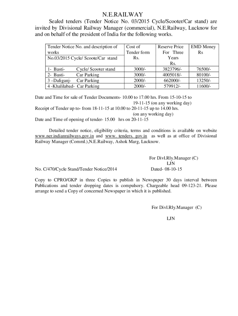 N.E.RAILWAY Sealed tenders (Tender Notice No. 03/2015 Cycle/Scooter/Car stand) are invited by Divisional Railway Manager (commercial), N.E. Railway, Lucknow for and on behalf of the president of India