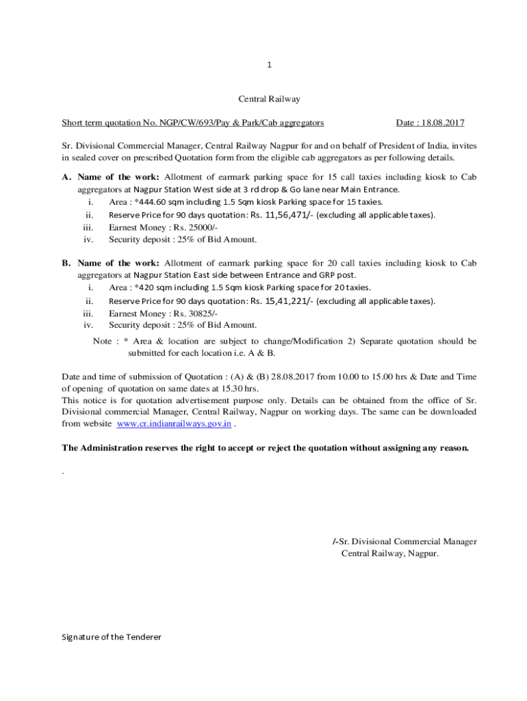 1Central Railway Short term quotation No. NGC/CW/693/Pay & Park/Cab aggregatorsDate : 18.08.2017Sr. Divisional Commercial Manager, Central Railway Nagpur for and on behalf of President of India, invites